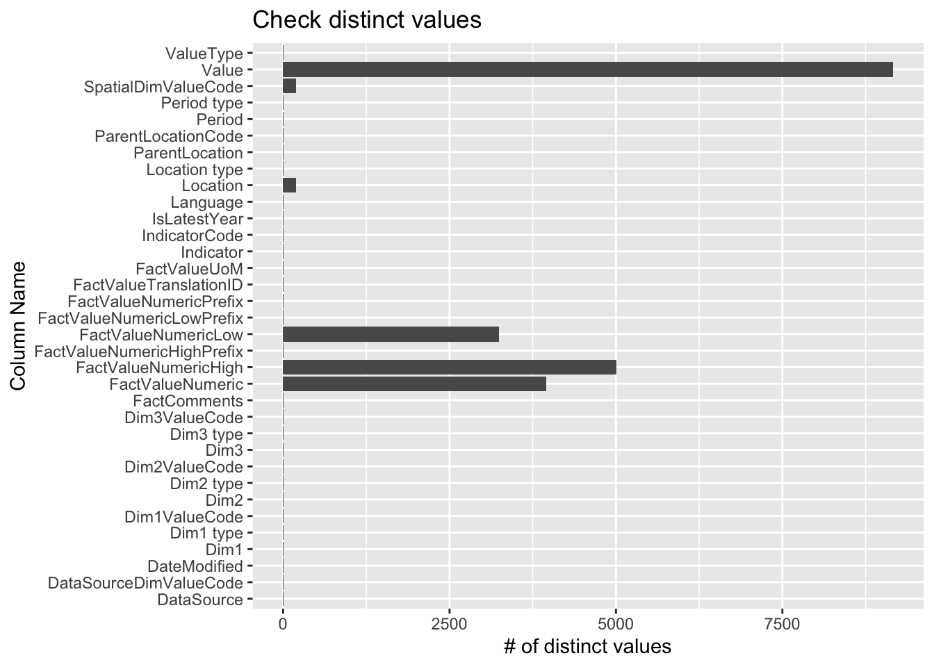 # count distinct valuesdistinct_counts <- data %>%summarise_all(n_distinct)long_data <-pivot_longer(distinct_counts, cols =everything(), names_to ="ColumnName", values_to ="DistinctCount")# plot the number of distinct values per column in our datasetggplot(long_data, aes(x = ColumnName, y = DistinctCount)) +geom_bar(stat ="identity") +coord_flip()+labs(x ="Column Name", y ="# of distinct values", title ="Check distinct values")