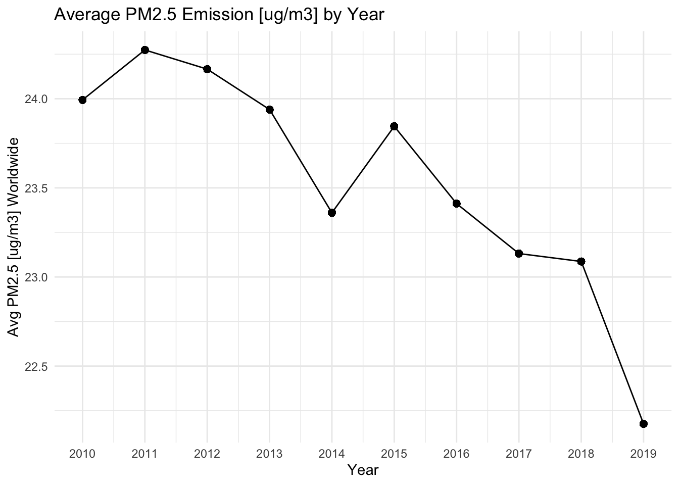 data <- df %>%group_by(Period) %>%mutate(YearlyE =mean(FactValueNumeric))ggplot(data, aes(x = Period, y = YearlyE)) +geom_line() +geom_point(size =2) +theme_minimal() +labs(title ="Average PM2.5 Emission [ug/m3] by Year",x ="Year",y ="Avg PM2.5 [ug/m3] Worldwide") +scale_x_continuous(breaks =seq(min(data$Period), max(data$Period), by =1))