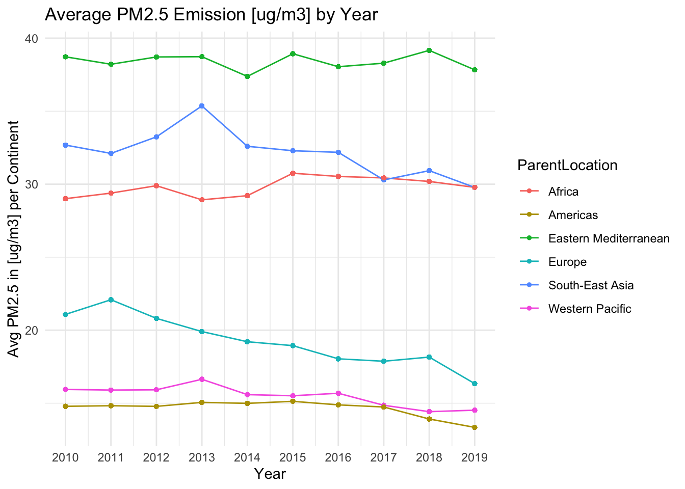 data <- data %>%group_by(ParentLocation, Period) %>%mutate(YearlyContE =mean(FactValueNumeric)) %>%ungroup()ggplot(data, aes(x = Period, y = YearlyContE, color = ParentLocation)) +geom_line() +geom_point(size =1) +theme_minimal() +labs(title ="Average PM2.5 Emission [ug/m3] by Year",x ="Year",y ="Avg PM2.5 in [ug/m3] per Continent") +scale_x_continuous(breaks =seq(min(data$Period), max(data$Period), by =1))