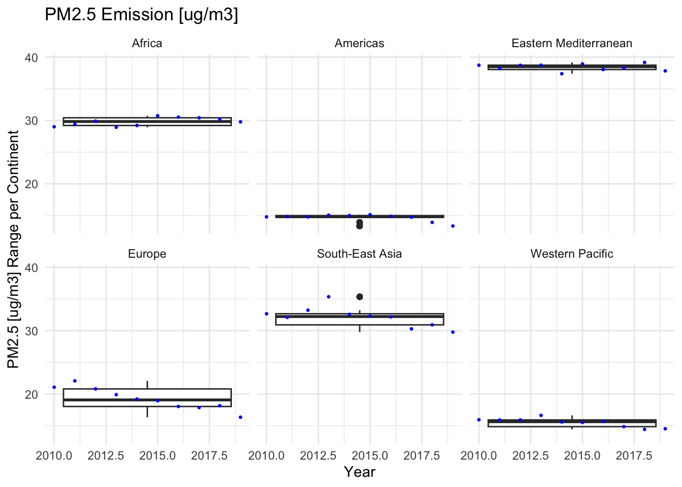 ggplot(data, aes(x = Period, y = YearlyContE)) +geom_boxplot() +stat_summary(fun = mean, geom ="point", shape =20, size =1, color ="blue") +facet_wrap(~ ParentLocation) +theme_minimal() +labs(title ="PM2.5 Emission [ug/m3]",x ="Year",y ="PM2.5 [ug/m3] Range per Continent")
