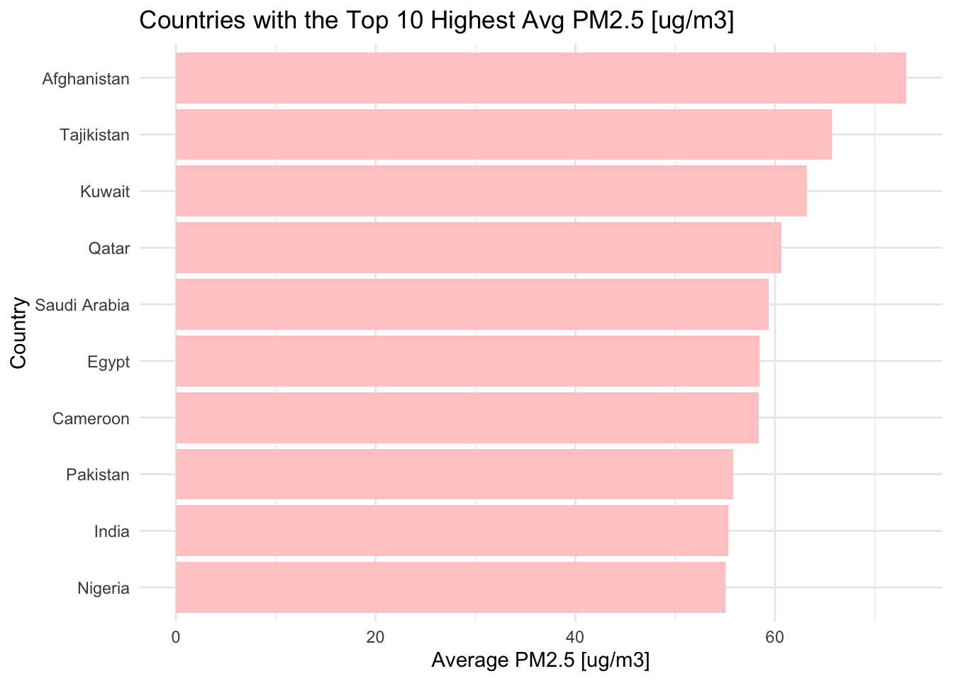 data <- data %>%group_by(ParentLocation) %>%mutate(ContE =mean(FactValueNumeric)) %>%ungroup()data <- data %>%group_by(Location) %>%mutate(LocE =mean(FactValueNumeric)) %>%ungroup()top_countries <- data %>%distinct(Location, LocE) %>%top_n(10, LocE)bot_countries <- data %>%distinct(Location, LocE) %>%top_n(-10, LocE)ggplot(top_countries, aes(x =reorder(Location, LocE), y = LocE)) +geom_bar(stat ="identity", fill ="#FFCCCC") +coord_flip() +labs(title ="Countries with the Top 10 Highest Avg PM2.5 [ug/m3]",x ="Country",y ="Average PM2.5 [ug/m3]") +theme_minimal()
