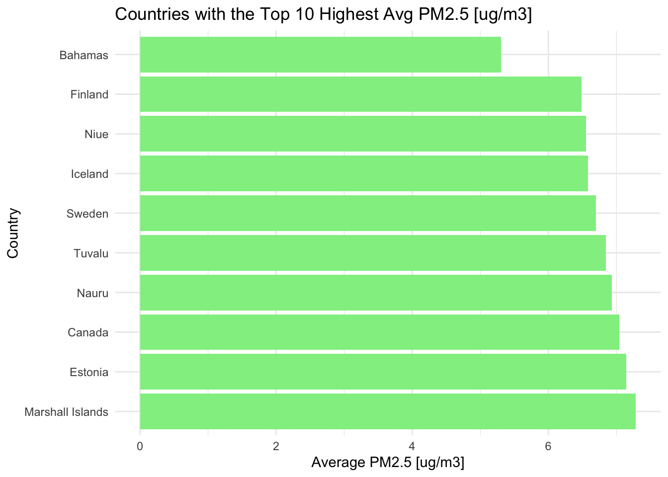 ggplot(bot_countries, aes(x =reorder(Location, -LocE), y = LocE)) +geom_bar(stat ="identity", fill='lightgreen') +coord_flip() +labs(title ="Countries with the Top 10 Highest Avg PM2.5 [ug/m3]",x ="Country",y ="Average PM2.5 [ug/m3]") +theme_minimal()