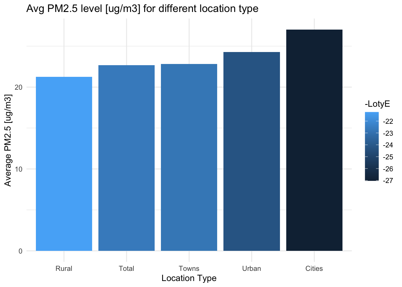 data <- data %>%group_by(Dim1) %>%mutate(LotyE =mean(FactValueNumeric)) %>%ungroup()d_data <-unique(data[c("Dim1", "LotyE")])ggplot(d_data, aes(x =reorder(Dim1, LotyE), y = LotyE, fill=-LotyE)) +geom_bar(stat ="identity") +labs(title ="Avg PM2.5 level [ug/m3] for different location type",x ="Location Type",y ="Average PM2.5 [ug/m3]") +theme_minimal()