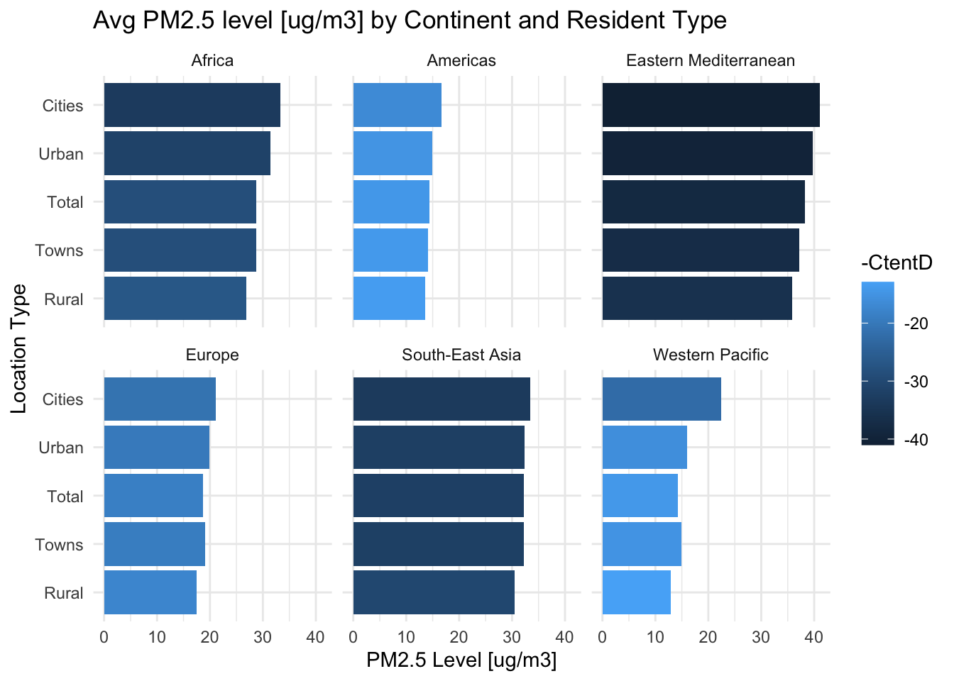 data <- data %>%group_by(ParentLocation, Dim1) %>%mutate(CtentD =mean(FactValueNumeric)) %>%ungroup()d_data <-unique(data[c("ParentLocation", "Dim1", "CtentD")])ggplot(d_data, aes(x =reorder(Dim1, CtentD), y = CtentD, fill =-CtentD)) +geom_bar(stat ="identity") +facet_wrap(~ ParentLocation) +coord_flip() +labs(x ="Location Type", y ="PM2.5 Level [ug/m3]", title ="Avg PM2.5 level [ug/m3] by Continent and Resident Type") +theme_minimal()